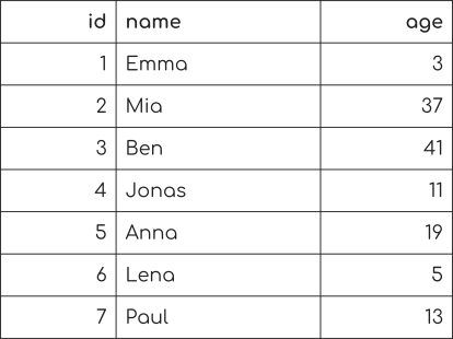 假设我们有这个数据库的人名表及其相应的年龄,当他们开始编程时。