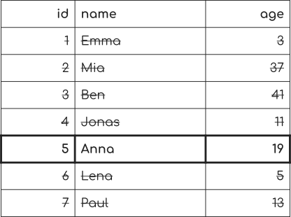 那么,这很容易。 我们只查看表中的每一行,检查条件是否适用,如果是,则返回该行。