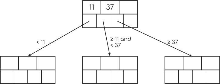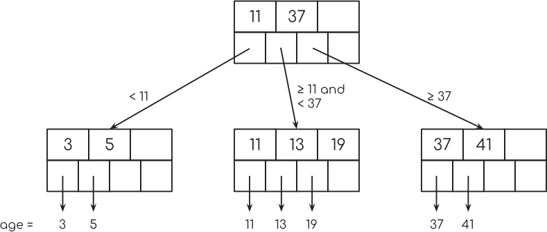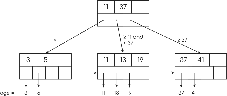 然后最左边的指针指向一个节点的键小于11.第二个指针指向一个节点,其键大于或等于11,小于37.第三个指针指向一个键大于或等于37的节点。