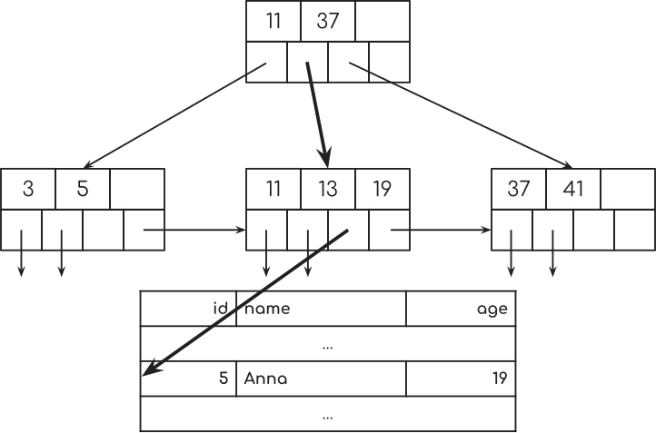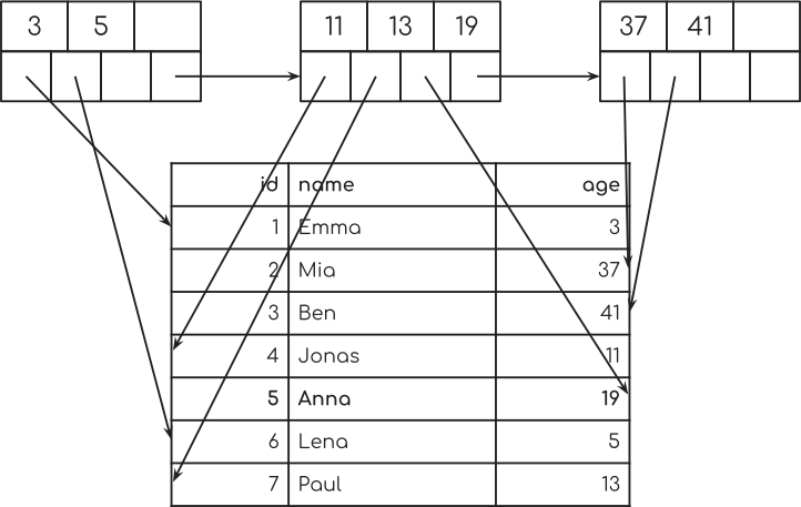 现在的魔法就是第二行节点中的指针。 它们中的每一个指向表中具有特定键的单个行,在我们的示例中,这是年龄。