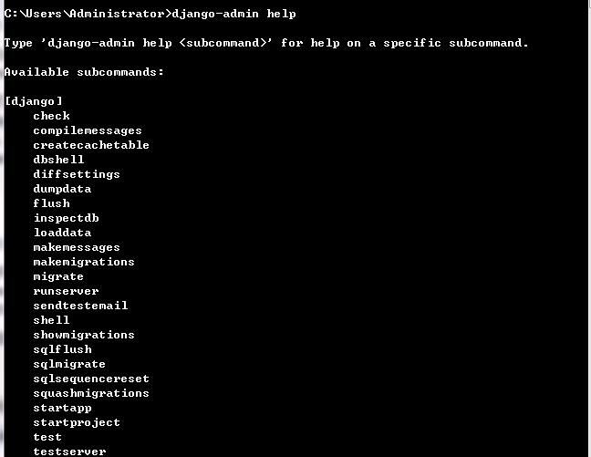 回到cmd界面中,运行“ django-admin help ”,我们可以看到django的命令列表。