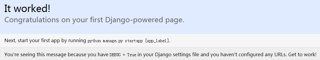 在项目的根目录下,运行“ python manage.py runserver ”命令,Django会以127.0.0.0:8000默认配置启动开发服务器。在浏览器地址栏中输入“ 127.0.0.1:8000 ”会看到如下界面,表示Django一切正常。