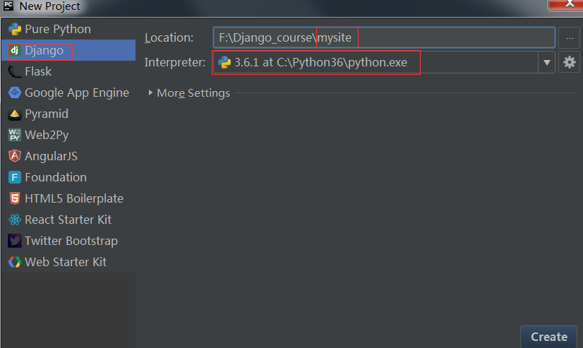 Pycharm是Python的集成环境。启动Pycharm后,点击“ file-->new project ”命令,会出现下图的对话框。选择Django栏目,输入项目名称,选择好Python解释器,单击“ create ”按钮创建。