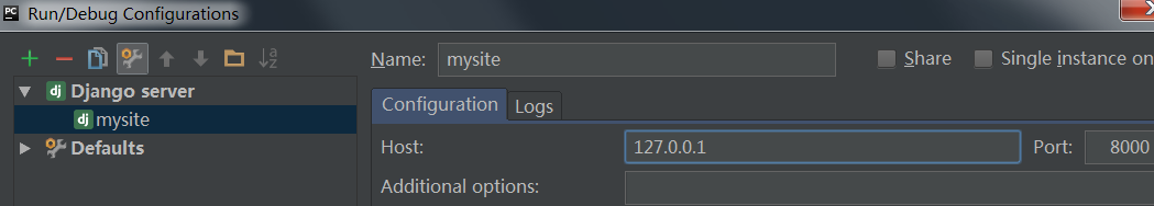 在Pycharm的上部工具中找到项目名称,在其下拉框中单击“ edit configurations ”,配置Host地址和端口号后,单击绿色小三角,开发服务器就运行起来了。