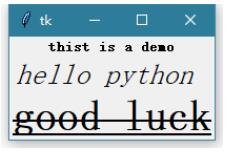 # -*- coding: utf-8 -*- from tkinter import * # 引入字体模块 import tkinter.font as tkFont root = Tk() # 创建一个Label # 指定字体名称、大小、样式 ft = tkFont.Font(family='Fixdsys', size=10, weight=tkFont.BOLD) ft1 = tkFont.Font(size=20, slant=tkFont.ITALIC) ft2 = tkFont.Font(size=30, weight=tkFont.BOLD, underline=1, overstrike=1) Label(root, text='thist is a demo', font=ft).grid() Label(root, text='hello python ', font=ft1).grid() Label(root, text='good luck', font=ft2).grid() root.mainloop() # 使用tkFont.Font来创建字体。