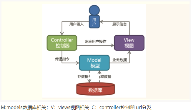 | M:models数据库相关;V:views视图相关 C:controller控制器 url分发 |
