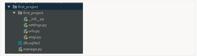 当前目录下会生成first_project的工程,目录结构如下:(大家注意昂,pip下载下来的django你就理解成一个模块,而不是django项目,这个模块可以帮我们创建django项目)