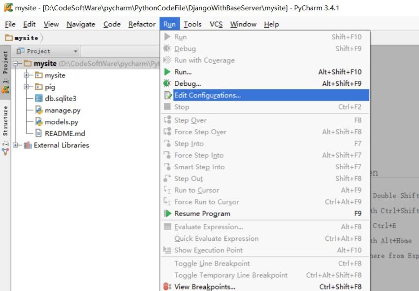 1 首先在Pycharm中打开你的Django项目,点击上面编辑栏上的run->Edit Configurations 如下图1: