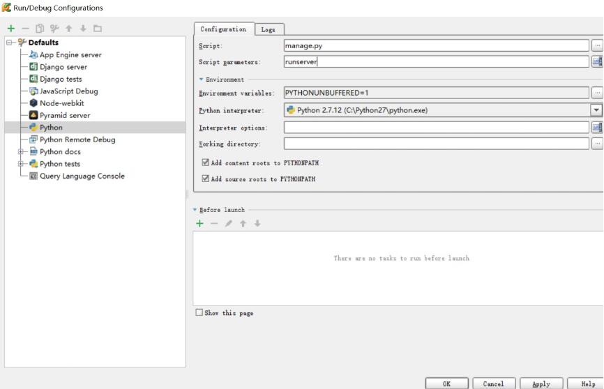 2 在打开的窗口中,把Defaults的+号打开,点击Python。然后在出现的右侧窗口中输入以下数据: Script: manage.py Script Parameters: runserver 。输入完毕后右下角点击Apply按钮 如下图2:
