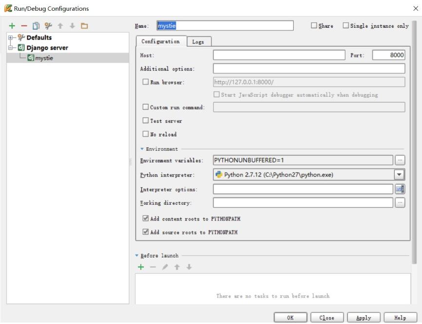 3 点击左上角+号新建一个Django server ,在弹出的窗口中输入 Name:mystie,右下角点击Apply。