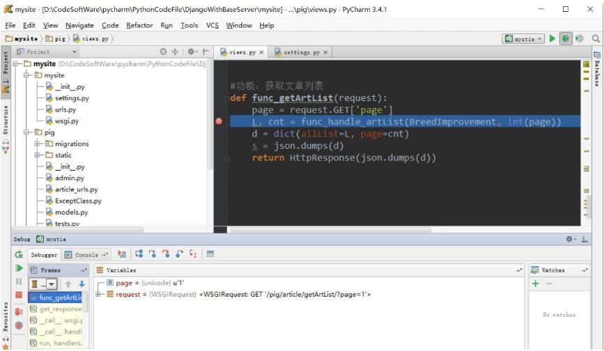 4 在你要调试的Django代码中设置断点,并点击右上角调试按钮(虫子图标),等待启动完成即可进入调试。