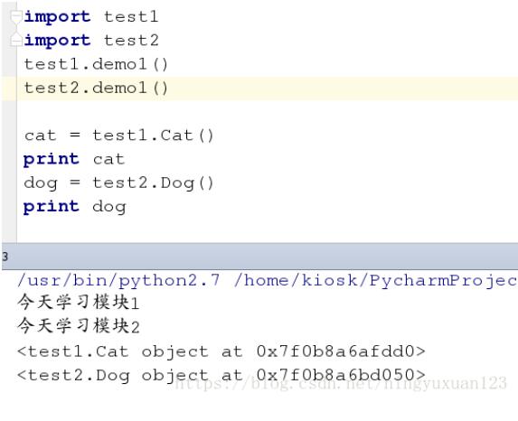 import test1 import test2 test1.demo1() test2.demo1() cat = test1.Cat() print cat dog = test2.Dog() print dog