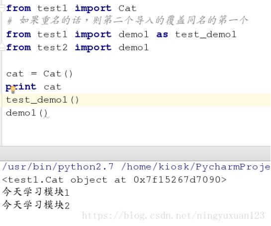 from test1 import Cat # 如果重名的话,则第二个导入的覆盖同名的第一个 from test1 import demo1 as test_demo1 from test2 import demo1 cat = Cat() print cat test_demo1() demo1()