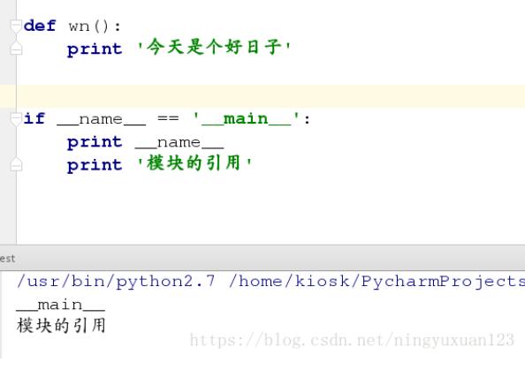 def wn(): print '今天是个好日子' if __name__ == '__main__': print __name__ print '模块的引用'
