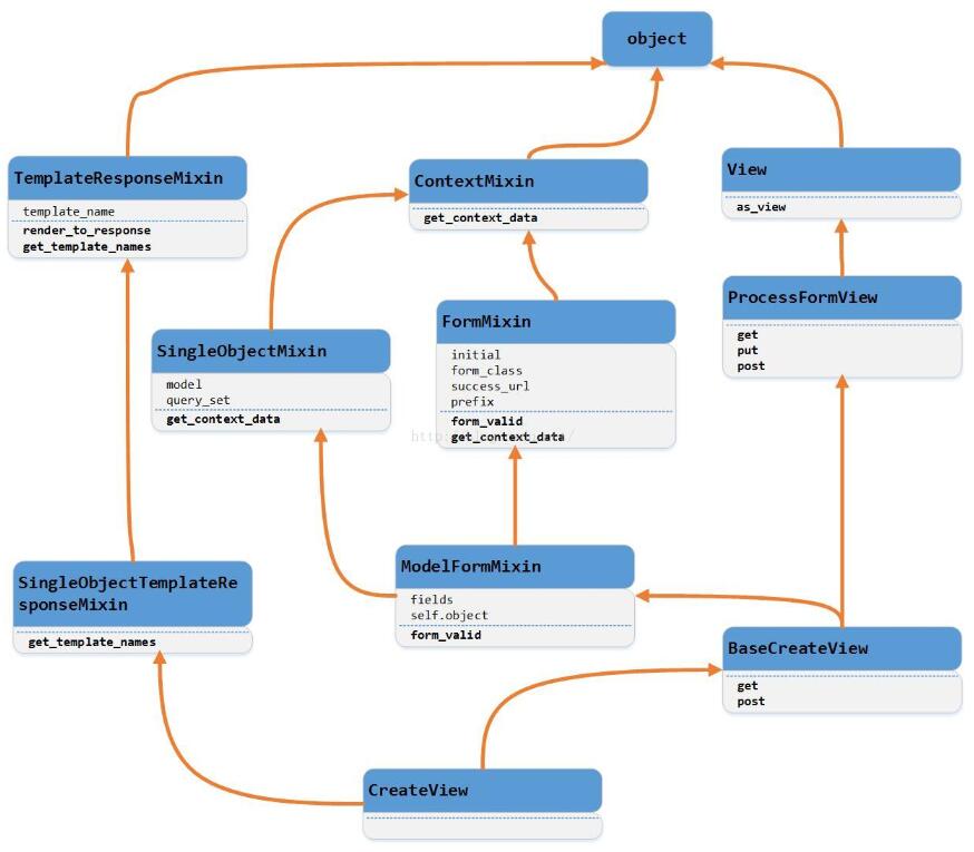 通用视图使用时,只需要承继后,再设置model或者form_class即可。比如CreateView就会由django自动的把页面上POST出的form数据解析到model生成的表单(或者form_calss指定的ModelForm类型表单),同时调用表单的save方法将数据添加到模型对应的数据库表中。当然GET请求时会生成空form到页面上。可以看到,除去定义model或者form类外,几行代码就可以搞定这么多事。我们看看CreateView的继承关系: