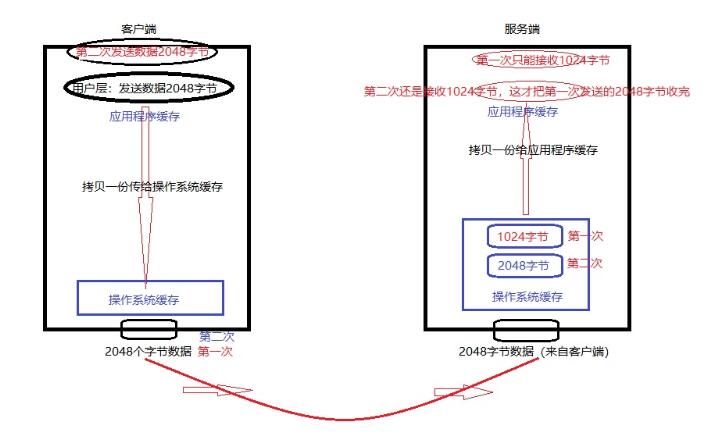 但是由于tcp协议是一种流式协议,流式协议就会有一个特点:数据的传输像一涓涓水流的形式传输,我们在收数据的时候默认最大收数据大小为1024字节,当发送的数据小于1024字节时候当然不会有问题,一次性全部收完,但是但是但是当发送的数据大于1024字节的时候,我们这边又不知道发送的数据大小是多少,只能默认的1024字节的时候,数据一次性就不可能收完,只能在这次收1024字节,那1024字节以外的数据呢?由于数据的传输是流式协议,所以没有收完的数据会依次排队在门外等着,等待你下次收数据时候再次收取,这样如果每次传的数据大小不确认,收的时候数据也不知道该收多少的时候,就会导致每次收数据的时候收不完,收不完的数据就会在缓存中排队,等待下次收,收不完的数据就好像粘粘在一起(zhan nian)。这就叫tcp的流式协议的通信粘包问题。