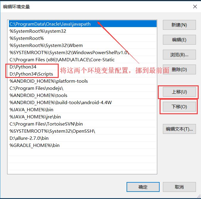 2、在系统的环境变量中,将python的环境变量(上图中第三个),配置到最前面即可。配置步骤如下(图片为win10系统):