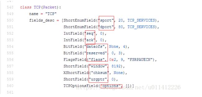 L2层在l2.python,ip,tcp等在inet.py中,例如tcp的一些字段名称在这: