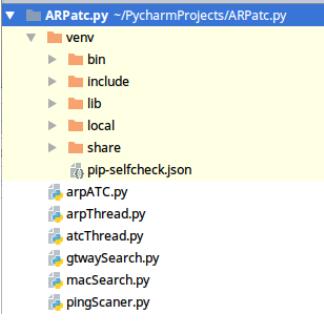 如图,代码分为六个部分。其中的arpATC.py为主程序,pingScanner.py为主机扫描器,arpThread.py为扫描线程,atcThread.py为发包线程,gtwaySearch.py获取网关,macSearch.py读取本机arp表。