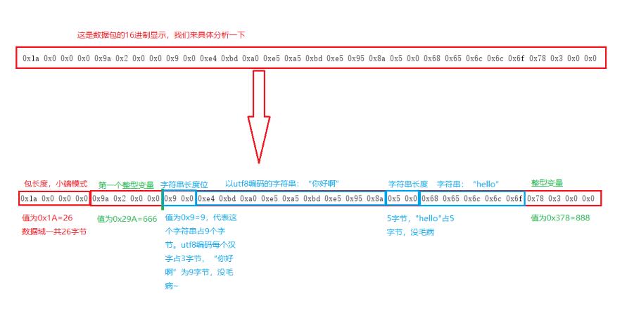 这个数据域一共存储了四个变量,开头和结尾是两个整型变量,中间是两个字符串变量。然后我们对这个数据域构建出来的数据包是这个样子的: