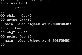 class Coo: pass obj1 = Coo() print (obj1) c = Coo obj2 = c() print (obj2)