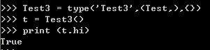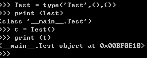 type关键字可以动态的创建类,接收参数(类名,父类元组,属性的字典),如创建一个类,没有父类,没有属性,命令如下: