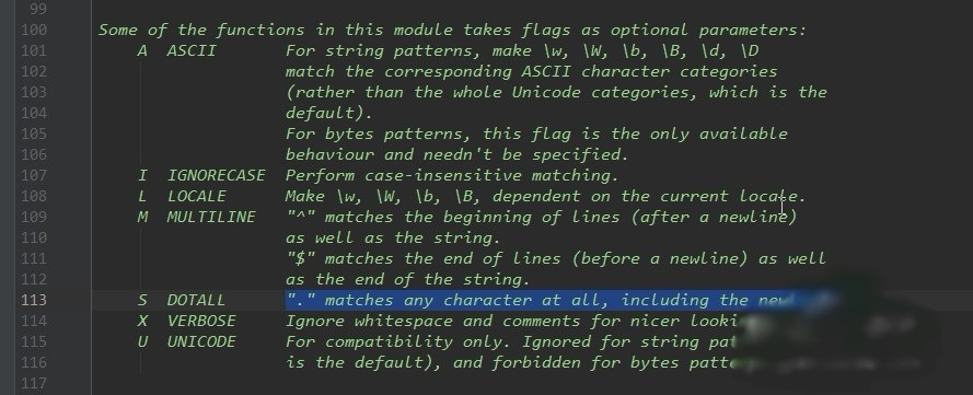 ②flags是可选参数,此标记是用来对patten的补充。例如:re.S,可以让正则表达式中的点匹配换行符\n。(如图片中,可以看帮助文档,查看有哪些标记)