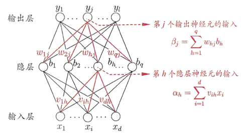 如上文所说,神经网络主要包括三个部分:结构、激励函数、学习规则。图1是一个三层的神经网络,输入层有d个节点,隐层有q个节点,输出层有l个节点。除了输入层,每一层的节点都包含一个非线性变换。