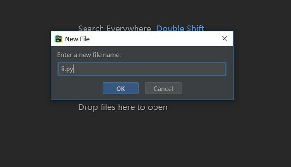 之后在新弹出的窗口输入我们的Python文件名称,后缀一定要填写" .py ",要不会出错,单击“OK”