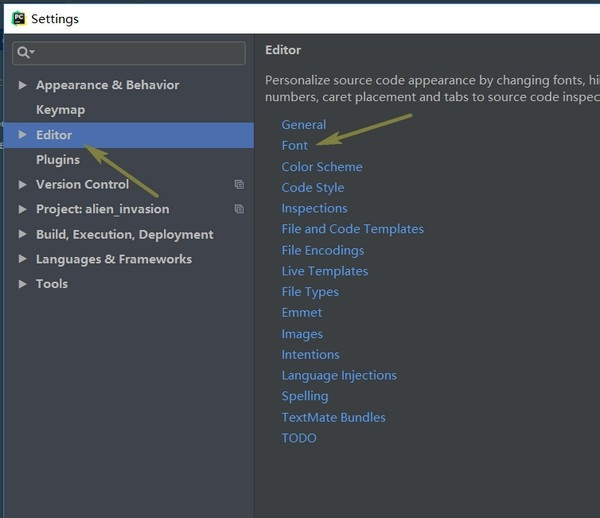 在打开的“settings”窗口中找到“Editor”单击,然后在右侧找到“Font”单击