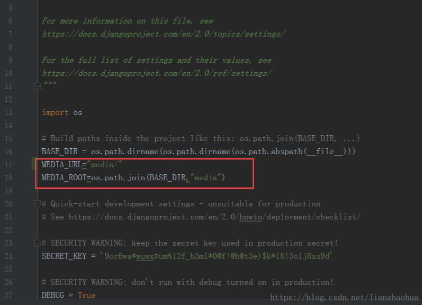 配置settings.py,增加上面代码使用的MEDIA_ROOT和后面即将使用的MDEIA_URL变量,如下: