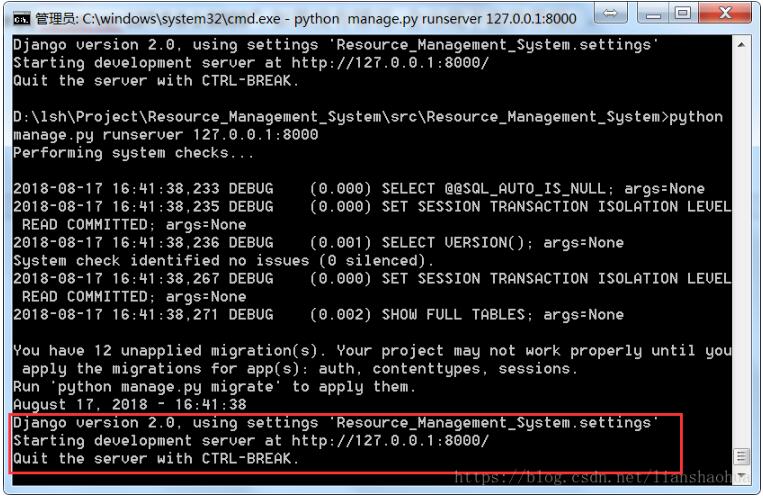 完成上述配置以后,打开cmd命令行窗口,切换到Resource_Management_System目录,执行命令:“python manage.py runserver 127.0.0.1:8000”,如果没有错误,会出现下面的界面: