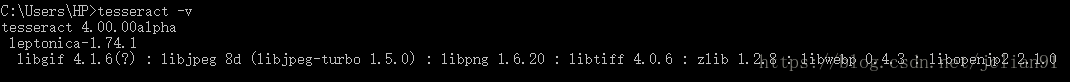 Tesseract的Windows安装包下载地址为: http://digi.bib.uni-mannheim.de/tesseract/tesseract-ocr-setup-4.00.00dev.exe ,下载后双击直接安装即可。安装完后,需要将Tesseract添加到系统变量中。在CMD中输入tesseract -v, 如显示以下界面,则表示Tesseract安装完成且添加到系统变量中。