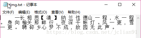 首先是E://figures/other/poems.jpg, 输入命令 tesseract E://figures/other/poems.jpg E://figures/other/poems.txt, 则会将poems.jpg中的识别文字写入到poems.txt中,如下图: