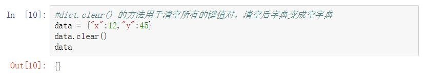 dict.clear() 的方法用于清空所有的键值对,清空后字典变成空字典。代码示例如下: