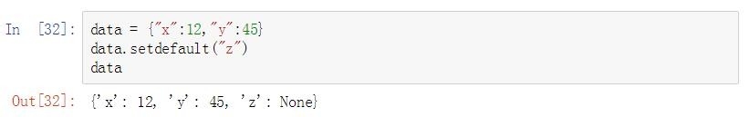 dict.setdefault() 的方法有点像dict.get() 的方法,可用来获取字典中的key对应的值。但不同于dict.get() 的方法,当访问的key值不存在时,dict.setfault() 的方法会将该值添加到原字典中,相应的value为None。代码示例如下: