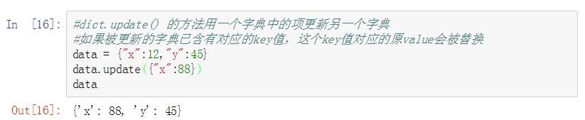 dict.update() 的方法用一个字典中的项更新另一个字典。如果被更新的字典已含有对应的key值,这个key值对应的原value会被替换。代码示例如下: