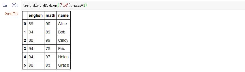 #pd.__version__ =='0.18.0' #drop columns test_dict_df.drop(['id'],axis=1) #test_dict_df.drop(columns=['id']) # official operation, maybe my pandas version needs update!