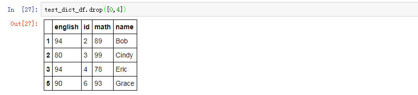 删除某一行,在上面删除列操作的时候也稍有提及,如果不加axis=1,则默认按照行号进行删除,例如要删除第0行和第4行: