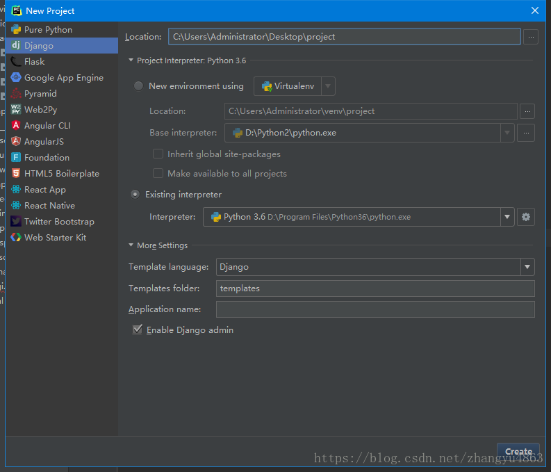 project interpreter 项目解释器 -> 我这里选择的是python 3.6