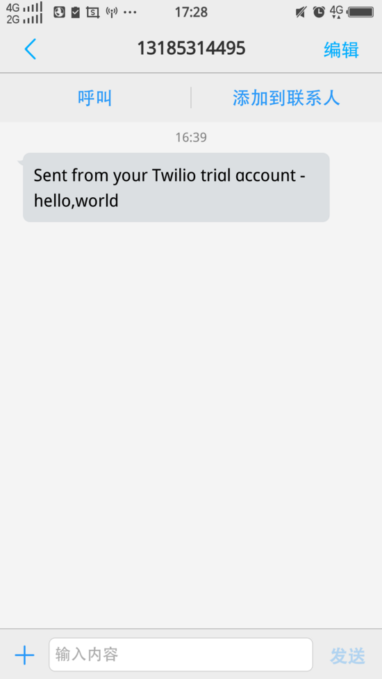from twilio.rest import Client def send_message(): account_sid="你的SID" auth_token="你的Token" client=Client(account_sid,auth_token) message=client.messages.create( to="+接收者的手机号,且必须是通过验证的手机号",#注意必须有+,并且中国手机号需要在前面加上86 from_="+网站发给你的手机号", body="hello,world" ) print(message.sid)