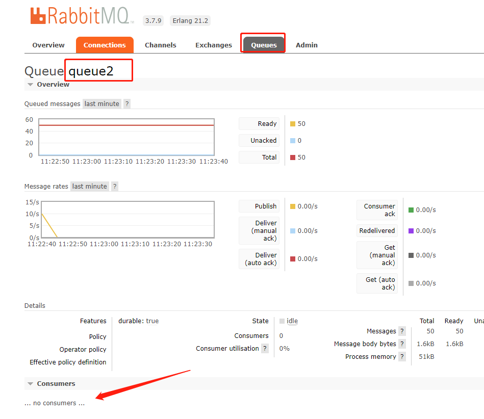 这样就产生了50条消息,但是没有消费者,所以没有被消费