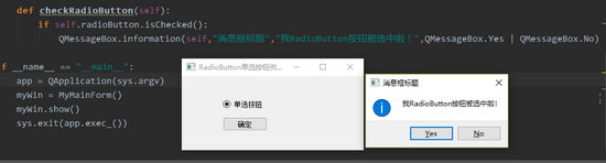 QMessageBox.information(self,"消息框标题","我RadioButton按钮被选中啦!",QMessageBox.Yes | QMessageBox.No)