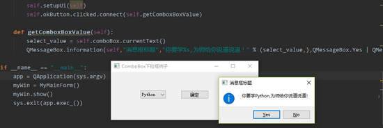 QMessageBox.information(self,"消息框标题","你要学%s,为师给你说道说道!" % (select_value,),QMessageBox.Yes | QMessageBox.No)