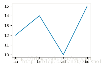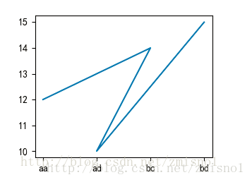 import matplotlib.pyplot as plt colums_x = ['aa','bc','ad','bd'] colums_y = [12,14,10,15] plt.plot(colums_x,colums_y) plt.show()