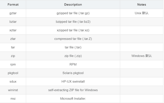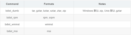 使用上,和 sdist 一样,可以使用 --formats 指定包格式。如: