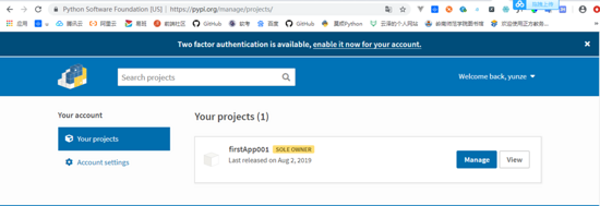填上自己的账号密码即可,这里配置了官方的 pypi 和 pypitest,若要配置其他仓库,按格式添加。回到 PyPI 主页即可看到上传的 firstApp001