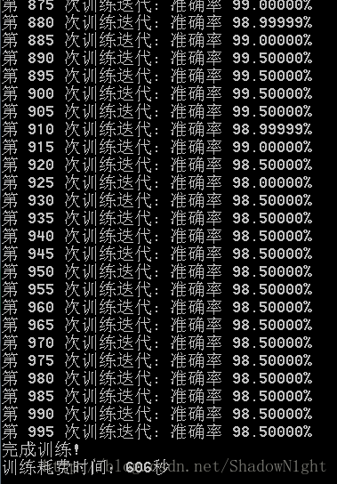 print ('第 %d 次训练迭代: 准确率 %0.5f%%' % (it, iterate_accuracy*100))