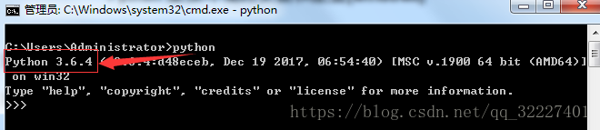 3、在命令行工具中输入python,检查是否安装成功,如出现下图所示提示则说明安装成功: