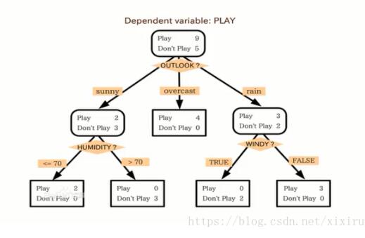 决策树生成:根据所选特征评估标准,从上至下递归地生成子节点,直到数据集不可分则停止决策树停止声场。